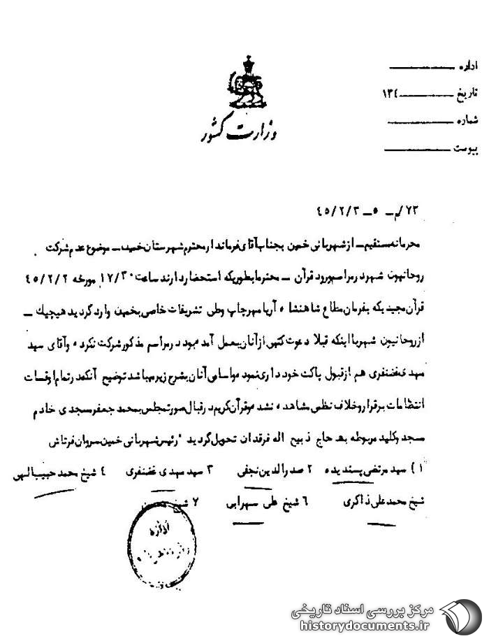 محترما بطوری که استحضار دارند ساعت 30 /17 مورخه 2 /2 /45 قرآن مجیدی که به فرمان شاهنشاه آریامهر چاپ1 و طی تشریفات خاصی به خمین وارد گردید هیچ یک از روحانیون شهر با اینکه قبلا دعوت کتبی از آنان به عمل آمده بود در مراسم مذکور شرکت نکرده و آقای سید مهدی غضنفری هم از قبول پاکت خودداری نموده و اسامی آنان به شرح زیر میباشد توضیح آن که در تمام اوقات انتظامات برقرار و خلاف نظمی مشاهده نشده و قرآن کریم در قبال صورت مجلس به محمد جعفر مسجدی خادم مسجد وکلید مربوطه به حاج ذبیح الله فرقدان تحویل گردید.