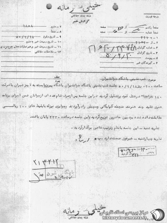 ساعت 0200 روز 18 /9 /50 جلسه شبنشینی باشگاه جوان شیران باشگاه پیروز وابسته به لاینز تهران با شرکت 180 نفر اعضاء در هتل کمودور تشکیل گردید در این جلسه پس از صرف شام عدهای از جوانان ضمن اجرای برنامه هنری تقلید چند هنرمند منجمله گلپایگانی و سهیلی را درآوردند و جوایزی نیز که با بلیطهای 100 ریالی مطابقت داده شده بود بین حاضرین توزیع گردید و این جلسه در ساعت 2330 پایان یافت.