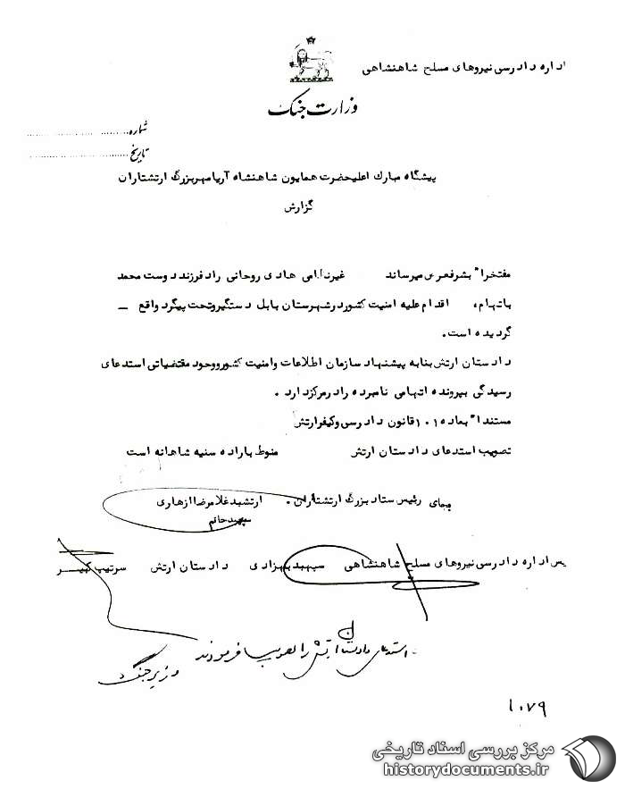 مفتخراً به شرف عرض میرساند غیرنظامی هادی روحانیراد، فرزند دوستمحمد به اتهام اقدام علیه امنیت کشور در شهرستان بابل دستگیر و تحت پیگرد واقع گردیده است. دادستان ارتش بنا به پیشنهاد سازمان اطلاعات و امنیت کشور و وجود مقتضیاتی استدعای رسیدگی به پرونده اتهامی نامبرده را در مرکز دارد. مستنداً به ماده 11 قانون دادرسی و کیفر ارتش تصویب استدعای دادستان ارتش منوط به ارادهی سنیهی شاهانه است.