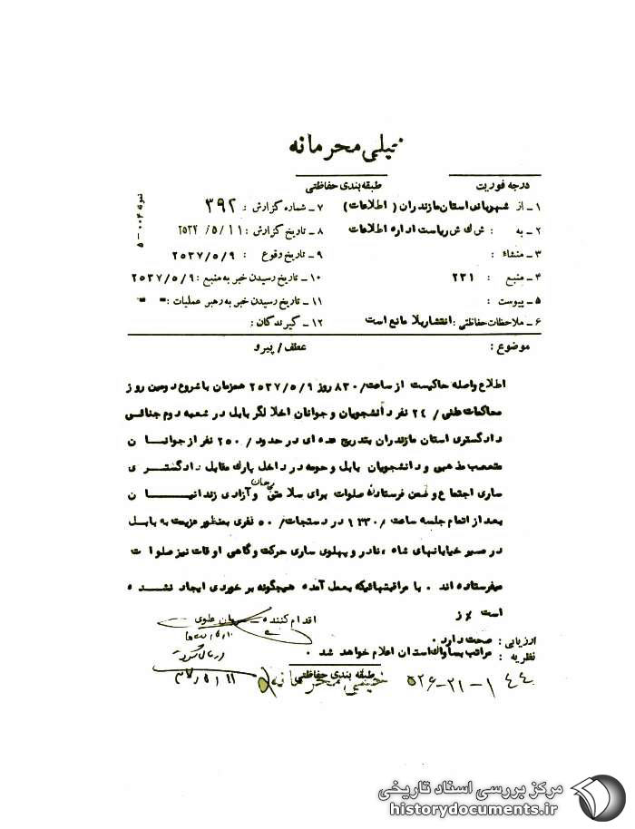 اطلاع واصله حاکیست از ساعت830 روز 9 /5 /2537 همزمان با شروع دومین روز محاکمات علنی 24 نفر دانشجویان و جوانان اخلالگر بابل در شعبه دوم جنائی دادگستری استان مازندران بهتدریج عدهای در حدود250 نفر از جوانان متعصب مذهبی و دانشجویان بابل و حومه در داخل پارک مقابل دادگستری ساری اجتماع و ضمن فرستادن صلوات برای سلامتی مجاهدان و آزادی زندانیان بعد از اتمام جلسه ساعت 1330 در دستجات 50 نفری به منظور عزیمت به بابل در مسیر خیابانهای شاه، نادر و پهلوی ساری حرکت و گاهی اوقات نیز صلوات میفرستادهاند با مراقبتهاییکه به عمل آمده هیچگونه برخوردی ایجاد نشده است. ز