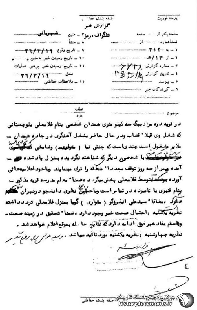 در قریه دره مرادبیگ سه کیلومتری همدان شخصی به نام غلامعلی بلوچستانی که شغل وی قبلاً قصاب و در حال حاضر به شغل آهنگری در جاده همدان ملایر مشغول است چندی است که جنتینیا و شامخی که متواری هستند هر چند ماه یک مرتبه با شخص دیگری که شناخته نگردیده به منزل یاد شده آمده و پس از سه روز توقف مجدداً منطقه را ترک مینمایند و با خود اعلامیههایی را که آورده که توسط غلامعلی پخش میگردید، ضمناً معلم مدرسه قریه مذکور بنام قنبری با نامبرده در تماس است و با علی نظری دانشجو در تهران در تمام شهر، مضافاً سیدعلی اندرزگو (متواری) گویا به منزل غلامعلی تردد داشته.