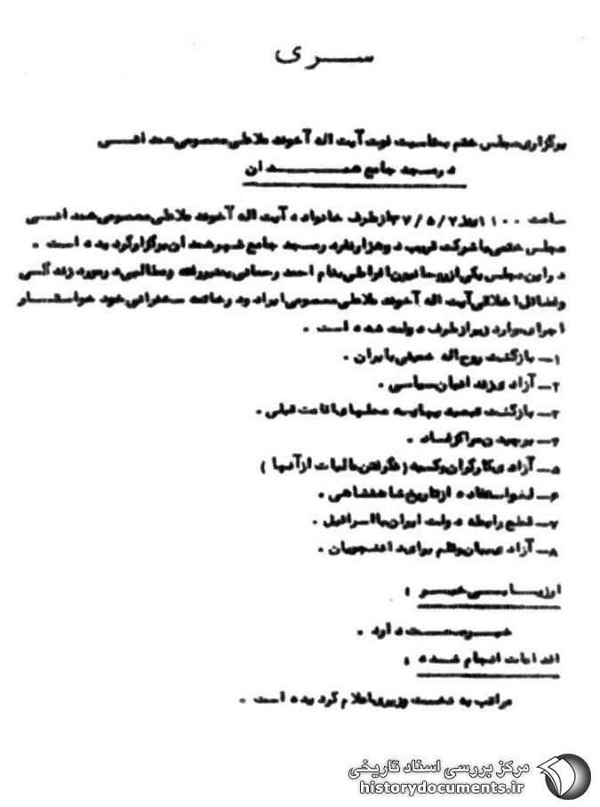 در این مجلس یکی از روحانیون افراطی بنام احمد رحمانی به منبر رفته و مطالبی در مورد زندگی و فضائل اخلاقی آیتاله اخوند ملاعلی معصومی ایراد و در خاتمه سخنرانی خود خواستار اجرای موارد زیر از طرف دولت شده است.