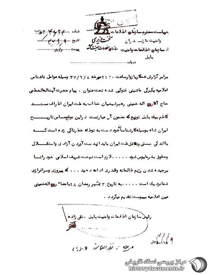 برابر گزارش همکار پازوار ساعت 2130 مورخه 8 /6 /37 وسیله عوامل ناشناس اعلامیه یک برگی ماشینی فتوکپی شده تحت عنوان: پیام حضرت آیتالله العظمی حاج آقا روحالله خمینی رهبر شیعیان خطاب به ملّت ایران اطراف مسجد کاظمبیک بابل توزیع که مضمون آن عبارتست در این موقع حساس تاریخ ایران شاه بوسیله کارشناسان خود دست به توطئه خطرناکی زده است که با اندکی سستی و تغافل ملّت ایران باید از به دست آوردن آزادی و استقلال و حقوق بشر مایوس شود....... لازم است نهضت شریف اسلامی خود را تا برچیده شدن رژیم ظالمانه و قلدری ادامه دهید..... که پیروزی و سرافرازی شما نزدیک است....... به تاریخ 23 شهر رمضان 98، به امضاء روحالله خمینی. عین اعلامیه به پیوست تقدیم میگردد.