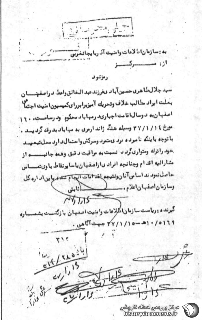گیرنده: ریاست سازمان اطلاعات و امنیت اصفهان بازگشت به شماره 5196 /10 ه- 15 /1 /37 جهت آگاهی