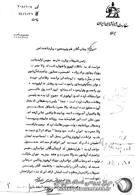 رئیس تشریفات وزارت خارجه سوئیس از اینجانب خواست که به ملاقات او بروم و اظهار داشت که والاحضرت بهزاد پهلوی برادرزاده اعلیحضرت همایون شاهنشاه آریامهر چندی پیش در ژنو به داروخانهای مراجعه و تقاضای خرید دعوای ]داروی[ مخدر و غیرمجازی را نموده است و در مقابل تذکر فروشنده وی را مصدوم و فرار نمودهاند به علاوه از پرداخت پول تاکسی نیز استنکاف کردهاند و داروفروش که مجروح گردیده به پلیس و مقامات شکایت کرده است. ضمناً پلیس در تحقیقاتی که به عمل آورده معلوم شده است که والاحضرت با محافل معتادین و قاچاقچیان آمد و رفت داشته و با چند قاچاقچی تماس گرفتهاند چون ممکن است این قضایا به دست روزنامهها بیفتد و سروصدا و جنجال برپا نمایند دولت سوئیس تقاضا دارد که ترتیب بازگشت والاحضرت به ایران داده شود و ضمناً نیز اقدام لازم نسبت به تادیه غرامات داروفروش و تاکسی به عمل آید. اینجانب به ایشان اطمینان دادم که نسبت به این امر اقدام مجدانه معمول خواهد گردید. به قرار تحقیقی که از جناب آقای خوانساری سفیر شاهنشاه آریامهر شد والاحضرت دو هفته پیش به تهران بازگشت فرمودهاند و جناب آقای خوانساری نیز با داروفروش و تاکسی در تماس هستند که رضایت آنان را جلب نمایند. بلافاصله آقای رئیس تشریفات را از جریان مطلع داشت ایشان از اقدامی که شده ابراز امتنان نمودند.