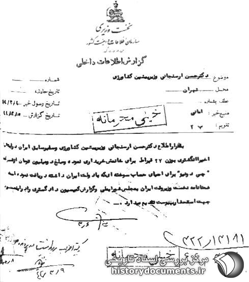 ضمناً نامه نخستوزیر وقت ایران به مجلس شوراىملى و گزارش کمیسیون دادگسترى را در این مورد جهت استحضار به پیوست تقدیم مىدارد.