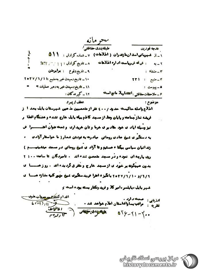 اطلاع واصله حاکیست حدود 400 نفر از متعصّبین مذهبی شهرستان بابل بعد از فریضه نماز جماعت و پایان وعظ از مسجد کاظمبیک بابل خارج نشده و هنگام افطار نیز [به] وسیله ایادی خود مقادیری خرما و نان خریداری و تحت عنوان اعتراض به دستگیری شیخ هادی روحانی مبادرت به نوشتن شعار (ما خواستار آزادی زندانیان سیاسی بیگناه هستیم و تا آزادی شیخ روحانی در مسجد مینشینیم) روی پارچهای نموده و در مسجد متحصّن شدهاند. نامبردگان تا ساعت 2100 بدون هیچگونه برخوردی از مسجد خارج و متفرق گردیدهاند. روزهای 9/ 6 و 10 /6 /2537 به انگیزه اعتراض به دستگیری شیخ مزبور کلیه مغازههای شهر بابل، بابلسر، امیرکلا و فریدونکنار بسته بوده است. اقدامکننده ـ سروان علوی