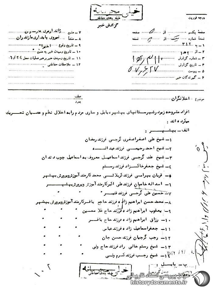 افراد مشروحه زیر در شهرستانهای بهشهر، بابل و ساری مردم را به اخلال نظم و عصیان تحریک میکرده اند: