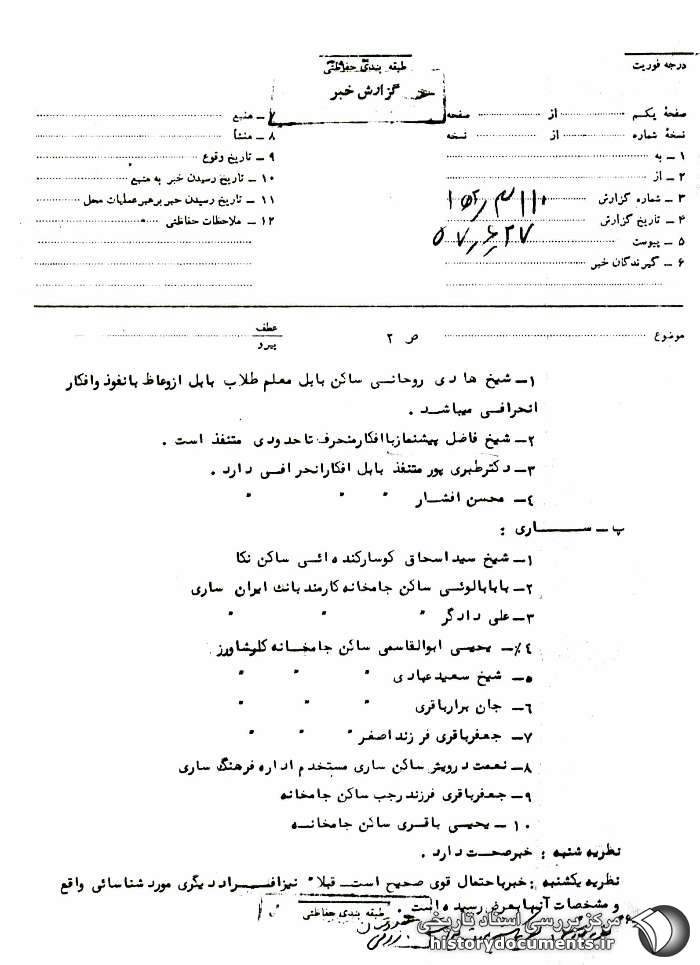 1- شیخ هادی روحانی، ساکن بابل، معلّم طلّاب بابل از وعاظ بانفوذ و [دارای] افکار انحرافی میباشد. 2- شیخ فاضل، پیشنماز با افکار منحرف تا حدودی متنفذ است. 3- دکتر طبریپور متنفذ بابل افکار انحرافی دارد.1 4- محسنیافشار متنفذ بابل افکار انحرافی دارد.