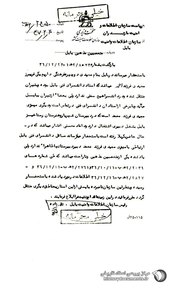 به استحضار میرساند در بابل به نام مجیدی دو چهرهی فرهنگی داریم یکی فریبرز مجیدی فرزند احمد میباشد که استاد دانشسرای فنی بابل بوده و به تهران منتقل شده بود و در دانشسرا هیچ سمتی ندارد ولی بعضاً از تهران به بابل میآید و با برخی از استادان دانشسرای فنی در تماس است و دیگری مهدی مجیدی فرزند محمد است که در دبیرستان شهریار و هنرستان رستاخیز بابل به شغل دبیری اشتغال دارد و داماد محسنیافشار میباشد که در حال حاضر به کربلا رفته است به استحضار میرساند مسائل دانشسرای فنی بابل ارتباطی با مهدی مجیدی فرزند محمد دبیر دبیرستانها ظاهراً ندارد ولی یادشده یکی از متعصّبین مذهبی و ناراحت میباشد که طیّ شمارههای 2036/ 2 ﻫ ب – 11 / 10 /36 و 2761 / 2 ﻫ ب – 11 /12 /36 و 2827 / 2 ﻫ ـ ب16 /12 /36 اطلاعات در مورد یادشده به استحضار رسیده و به نظر این سازمان نامبرده بایستی از این استان به مناطق دیگری منتقل گردد، مقرر فرمائید در این زمینه اقدام و نتیجه را ابلاغ فرمایند.