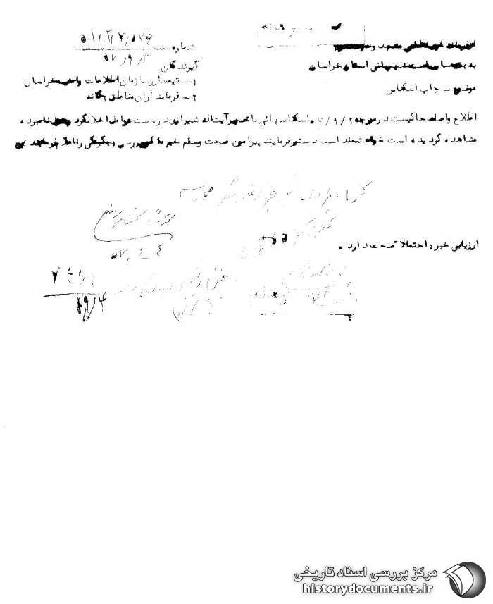 به: تیمسار ریاست شهربانی استان خراسان