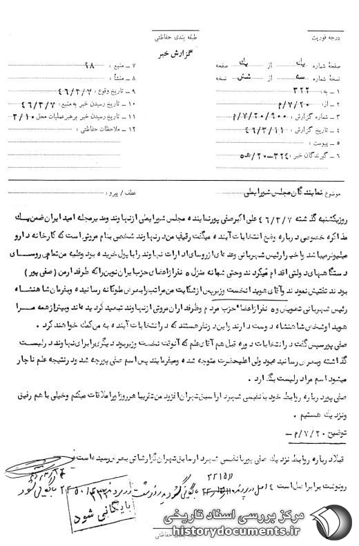 روز یکشنبه گذشته 7 /3 /46 علیاکبر صفیپور نماینده مجلس شورای ملی از نهاوند و مدیر مجله امید ایران ضمن یک مذاکره خصوصی درباره وضع انتخابات آینده میگفت: رقیب من در نهاوند شخصی به نام مروتی است که کارخانهدار و میلیونر میباشد و اخیراً رئیس شهربانی و عدهای از رؤسای ادارات نهاوند را با پول خریده بود و علیه من تمام رؤسای دستگاههای دولتی اقدام میکردند و حتی شبانه منزل 5 نفر از اعضای حزب ایران نوین را که طرفدار من (صفیپور) بودند تفتیش نمودند و آقای هویدا نخستوزیر پس از شکایت من، مراتب را به عرض ملوکانه رسانیده و به فرمان شاهنشاه، رئیس شهربانی تعویض و 5 نفر از اعضای حزب مردم و طرفداران مروتی از نهاوند تبعید گردیدهاند و بیش از همه مرا هویدا و شخص شاهنشاه دوست دارند و این دو نفر هستند که در انتخابات آینده به من کمک خواهند کرد.