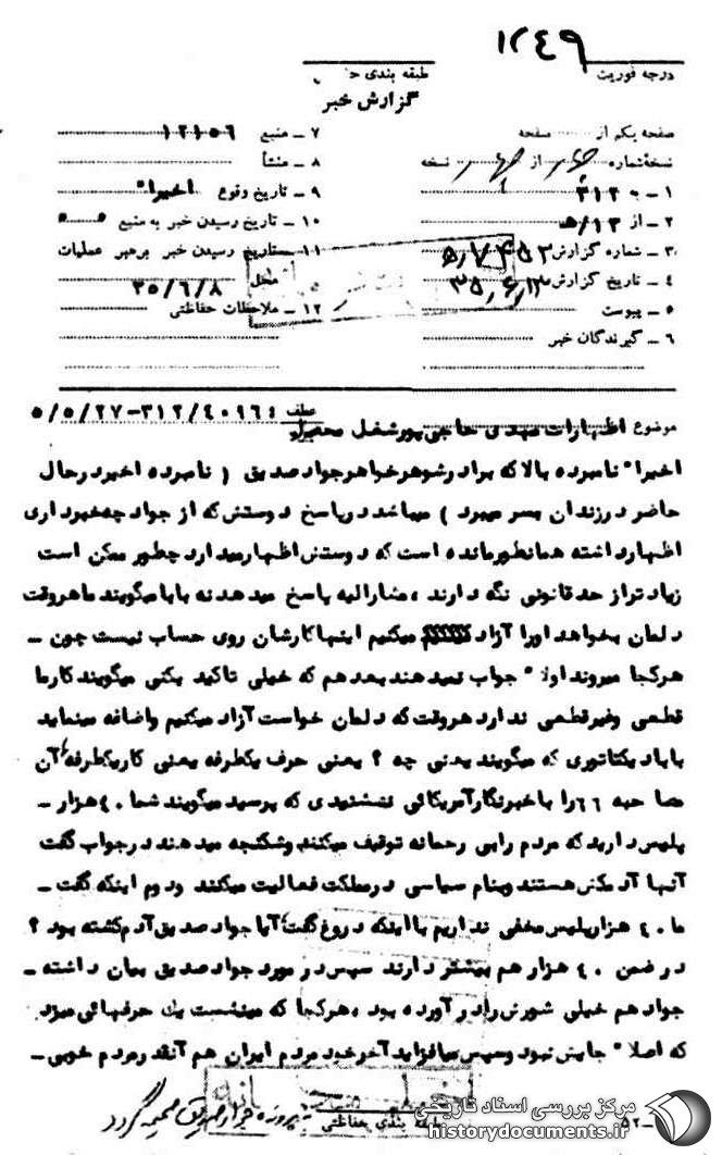 اخیراً نامبرده بالا که برادر شوهر خواهر جواد صدیق (نامبرده اخیر در حال حاضر در زندان به سر میبرد) میباشد در پاسخ دوستش که از جواد چه خبر داری اظهار داشته همانطور مانده است که دوستش اظهار میدارد چطور ممکن است زیادتر از حد قانونی نگه دارند، مشارالیه پاسخ میدهد نه بابا میگویند ما هر وقت دلمان بخواهد او را آزاد میکنیم اینها کارشان روی حساب نیست چون- هر کجا میروند اولاً جواب نمیدهند بعد هم که خیلی تاکید بکنی میگویند کار ما قطعی و غیر قطعی ندارد هر وقت که دلمان خواست آزاد میکنیم و اضافه مینماید بابا دیکتاتوری که میگویند یعنی چه؟ یعنی حرف یکطرفه یعنی کار یکطرفه آن مصاحبه 66 را با خبرنگار آمریکایی نشنیدی که پرسید میگویند شما 4۰ هزار پلیس دارید که مردم را بیرحمانه توقیف میکنند و شکنجه میدهند در جواب گفت آنها آدمکش هستند و به نام سیاسی در مملکت فعالیت میکنند و دوم اینکه گفت ما 4۰ هزار پلیس مخفی نداریم با اینکه دروغ گفت آیا جواد صدیق آدم کشته بود. در ضمن 40 هزار هم بیشتر دارند سپس در مورد جواد صدیق بیان داشته جواد هم خیلی شورش را درآورده بود، هر کجا که مینشست یک حرفهایی میزد که اصلاً جایش نبود و سپس میافزاید آخر خود مردم ایران هم آنقدر مردم خوبی نیستند، اصلاً بد استفاده میکنند مثلاً هر ادارهای که میروی رئیس آن کارمندان اداره، کارها را به عقب میاندازند، رشوه میخورند، آخر برای این مردم که از رئیس گرفته تا این کدخدا و بقال که در دهات است همه دزدند و بدجنس بروی خودت را به سمت نابودی بکشی، اصلاً مردم ایران بدجوری بار آمدهاند، سپس از کشورهای دیگر شروع به صحبت نمود که با این که دین ندارند چطور مردمش وظیفه شناس و انسان دوست و سپس میافزاید این دین و تبلیغات مذهبی که در ایران است، اگر در کشورها بود آنها فرشته میشدند /