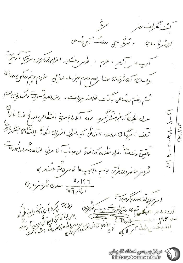 اکیپهای آژیر، فرم، طوسی و خشایار اعزامی از مرکز به سرتیپی آژیر جهت پاکسازی آن شهرستان روزهای دوم و سوم بهمن ماه در بابل چهارم و پنجم در آمل و روزهای ششم و هفتم در شاهی به گشت خواهند پرداخت. دستور دهید تسهیلات و همکاریهای لازم معمول بطوری که خبر منتشر نگردد ورود آنها را به مأمورین انتظامی ابلاغ ضمناً تا زمان توقف نامبردگان در حوزه استحفاظی یک نفر از افسران اطلاعاتی یا انتظامی به منظور بازجویی و تحقیق و شناسایی افراد مظنون که احتمالاً از جانب آنها معرفی خواهد شد در اطلاعات شهربانی حاضر و از طریق بیسیم با اکیپها تماس داشته باشند.
