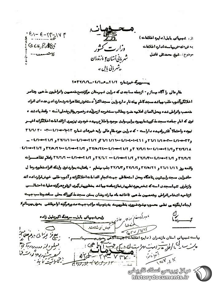 مقام عالی را آگاه میسازم از جمله مساجدی که در این شهرستان مرکز تجمع متعصّبین و افراطیون مذهبی و عناصر اخلالگر و آشوبطلب میباشد، مسجد کاظمبیک نام دارد و این مسجد اکثراً دستخوش تظاهرات و شعار دادن عدهای افراد متعصب و افراطی شده و محل الصاق اعلامیه مضرّه و مطالب مستخرجه از جراید در خصوص وقایع فعلی است. واعظ یادشده فوق که امام جماعت مسجد مذکور به شمار میرود برابر سوابق موجود و اطلاع رسیده، خود وی نیز مبری از اقدامات اخلالگرانه اخیر نبوده و احتمالاً نقش را عهدهدار است که در این مورد مقام عالی را به خبرهای شماره 13 – 6 – 5 – 1 /04 – 3 – 30 /9 / 36، 33 – 5 -1 /04- 3 – 15 /11 /36، 461- 1 -4 -1 /04 – 16 /11 / 36، 2 / 21 – 5 -1 /04 – 11 /1 /37، 2 /21 – 5 -1 /04 – 18 /2 /37، 2 /21 -5- 1 /04 – 19 / 2 /37، 2 /21 -5- 1 /04 – 24 / 5 /37، 2 /21 -5- 1 /04 – 29 / 5 /37، 2 /21 -5- 1 /04 – 2 / 6 /37، 2 /21 -5- 1 /04 – 3 / 6 /37، 2 /21 -5- 1 /04 – 4 / 6 /37 و 2 /21 -5- 1 /04 – 6 / 6 /37، و اعلام تظاهرات واقعه روز 16 /11 /36، 22 /5 /37، 4 /6/ 37 و 3 /6 /37 جلب مینمایم. با عنایت به موارد فوق و این که افراد منظور در حال حاضر این مسجد را بهترین پناهگاه و محل استحفاظی جهت آنجام اقدامات اخلالگرانه و آشوبطلبی خویش قرار دادهاند و از طرفی تنها مسجدی است که شخص مورد نظر پیشنماز جماعت میباشد به منظور پیشگیری از وقوع هرگونه عملیات احتمالی از ناحیه اشخاص افراطی و متعصّبین مذهبی تا خاتمه ماه مبارک رمضان بستن مسجد مذکور را که محلی مساعد و مناسب جهت ایجاد اینگونه بینظمی محسوب میشود، ضروری به نظر میرسد. بدینوسیله مراتب را جهت صدور هرگونه اوامر مقتضی به عرض میرسانم. رئیس شهربانی بابل ـ سرهنگ اکبر جلیلزاده