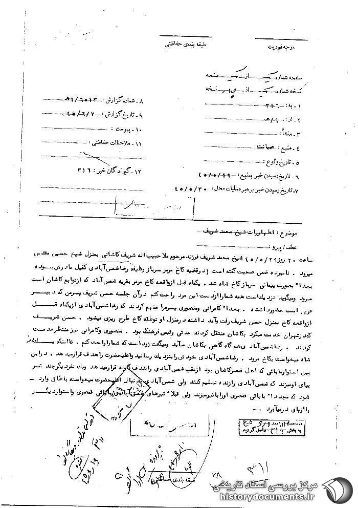 ساعت 20 روز 29 /5 /45 شیخ محمدشریف فرزند مرحوم ملا حبیباله شریف کاشانى به منزل شیخ حسین مقدس میرود. نامبرده ضمن صحبت گفته است (در قضیه کاخ مرمر سرباز وظیفه رضا شمسآبادى کفیل مادرش بوده بعداً به صورت پیمانى سرباز کاخ شاه شد. یکماه قبل از واقعه کاخ مرمر بقریه شمسآباد که از توابع کاشان است میرود و میگوید نزدیک است همه شما را از دست این مرد راحت کنم در آن جلسه حسن شریف پسر من که دبیر عربى است حضور داشته. بعداً کامرانى و منصورى پسر مرا متهم کردند که رضا شمسآبادى از یکماه قبل از واقعه کاخ به منزل حسن شریف رفت و آمد داشته در منزل او توطئه کاخ طرحریزى میشد. حسن شریف که در تهران خدمت میکرد به کاشان منتقل کردند مدتى رئیس فرهنگ بود. منصورى و کامرانى نیز منتظر خدمت کردند. رضا شمسآبادى هم گاهگاهى به کاشان میآمد و میگفت زود است که شما را راحت کنم. تا این که یک روز شاه میخواست بکاخ برود. رضا شمسآبادى خودش را بنزدیک رسانید و اعلیحضرت را هدف قرار میدهد. در این بین استوار بابائى که اهل قمصر کاشان بود از عقب شمسآبادى را هدف گلوله قرار میدهد و یک نفر دیگر چند تیر بپاى او میزند که شمسآبادى را زنده تسلیم کنند ولى شمسآبادى بدنبال اعلیحضرت میخواسته باطاق وارد شود که مجدداً بابائى قمصرى او را با تیر میزند ولى قبلاً تیرهاى شمسآبادى بابائى قمصرى و استوار دیگر را از پاى در میآورد.