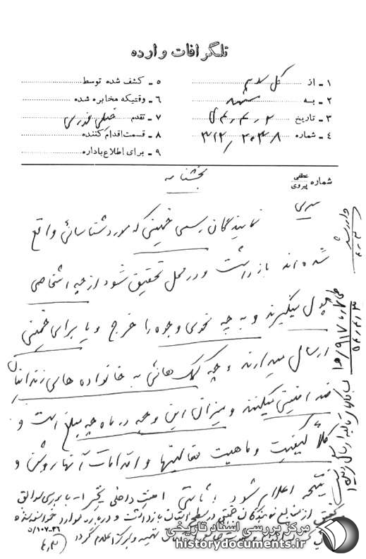 نمایندگان رسمی خمینی که مورد شناسایی واقع شدهاند بازداشت و در محل تحقیق شود از چه اشخاصی پول میگیرند و به چه نحوی وجوه را خرج و یا برای خمینی ارسال میدارند و چه کمکهایی به خانوادههای زندانیان ضدامنیتی میکنند و میزان این وجه در ماه چه مبلغ است و کلاً کیفیت و ماهیت فعالیتها و اقدامات آنها روشن و نتیجه اعلام شود.