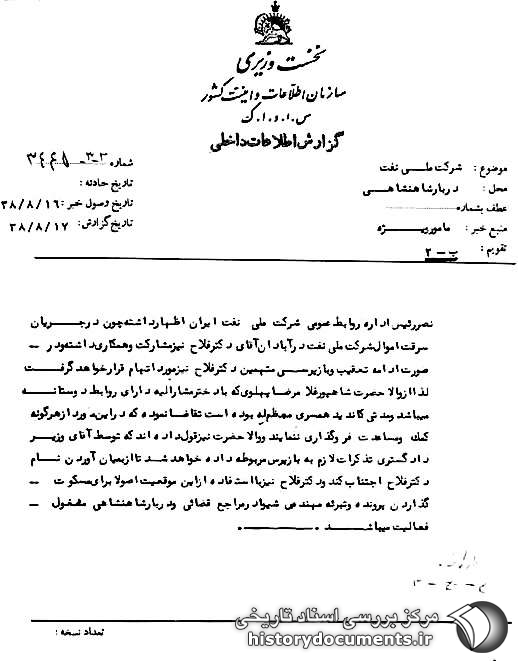 نصر، رئیس اداره روابط عمومی شرکت ملی نفت ایران، اظهار داشته: چون در جریان سرقت اموال شرکت ملی نفت در آبادان، آقای دکتر فلاح نیز مشارکت و همکاری داشته و در صورت ادامه تعقیب و بازپرسی متهمین، دکتر فلاح نیز مورد اتهام قرار خواهد گرفت، لذا از والاحضرت شاپور غلامرضا پهلوی که با دختر مشارالیه دارای روابط دوستانه میباشد و مدتی کاندید همسری معظمله بوده است، تقاضا نموده که در این مورد از هرگونه کمک و مساعدت فروگذاری ننمایند و والاحضرت نیز قول دادهاند که توسط آقای وزیر دادگستری، تذکرات لازم به بازپرس مربوطه داده خواهد شد، تا از به میان آوردن نام دکتر فلاح اجتناب کند و دکتر فلاح نیز با استفاده از این موقعیت، اصولاً برای مسکوت گذاردن پرونده و تبرئه مهندس شیوا در مراجع قضایی و دربار شاهنشاهی مشغول فعالیت میباشد.