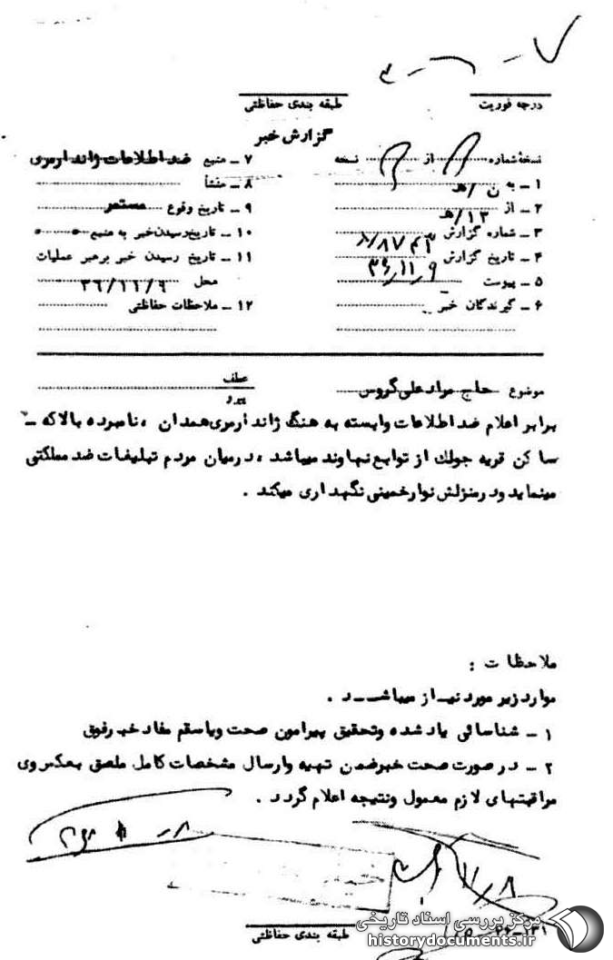 برابر اعلام ضد اطلاعات وابسته به هنگ ژاندارمری همدان، نامبرده بالا که ساکن قریه جولک از توابع نهاوند میباشد، در میان مردم تبلیغات ضد مملکتی مینماید و در منزلش نوار خمینی نگهداری میکند.