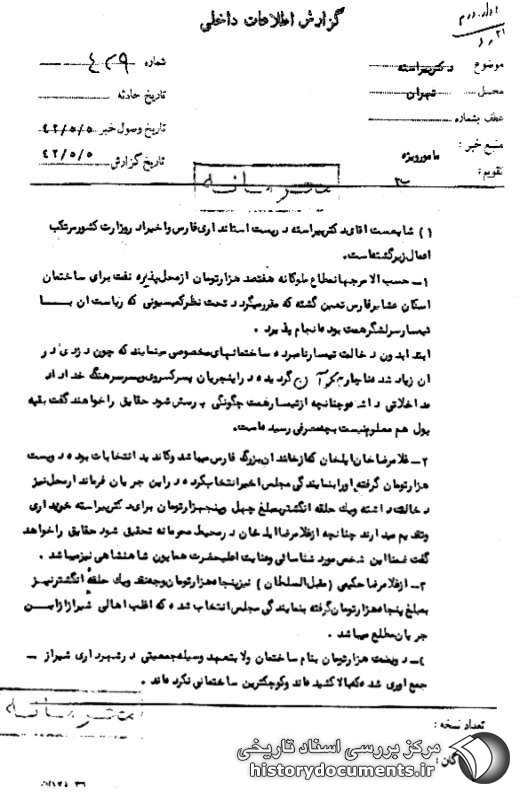 4ـ دویست هزار تومان به نام ساختمان ولایتعهد، وسیله جمعیتى در شهردارى شیراز جمعآورى شده که بالا کشیدهاند و کوچکترین ساختمانى نکردهاند.