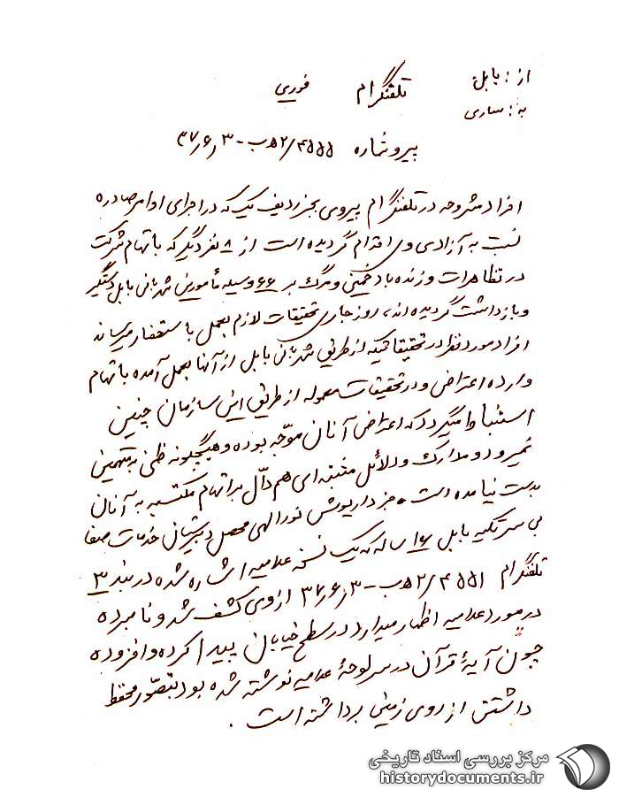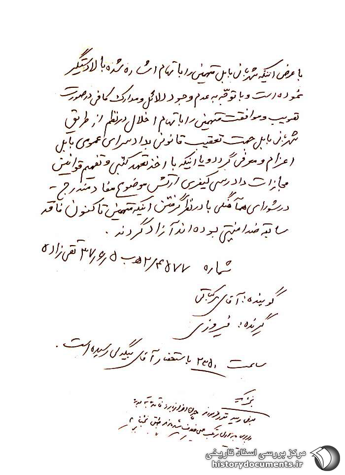 افراد مشروحه در تلفنگرام پیروی به جز ردیف یک که در اجرای اوامر صادره نسبت به آزادی وی اقدام گردیده است، از 8 نفر دیگر که به اتهام شرکت در تظاهرات و زنده باد خمینی و مرگ بر 66 وسیله مأمورین شهربانی بابل دستگیر و بازداشت گردیدهاند، روز جاری تحقیقات لازم به عمل[آمد] به استحضار میرساند افراد موردنظر در تحقیقاتی که از طریق شهربانی بابل از آنها به عمل آمده به اتهام وارده اعتراض و در تحقیقات معموله از طریق این سازمان چنین استنباط میگردد که اعتراض آنان موجه بوده و هیچگونه ظنی به متهمین نمیرود و مدارک و دلائل مثبتهای هم دال بر اتهام مکتسبه به آنان به دست نیامده است. جز داریوش نوراللّهی محصّل دبیرستان خدمات صفا بیسرتکیه بابل 16 ساله که یک نسخه اعلامیه اشاره شده در بند 3 تلفنگرام 4551/ 2 ﻫ ب – 3 /6 /37 از وی کشف شد و نامبرده در مورد اعلامیه اظهار میدارد در سطح خیابان پیدا کرده و افزوده چون آیۀ قرآن در سرلوحۀ اعلامیه نوشته شده بود به تصور محفظ داشتن از روی زمین برداشته است. با عرض اینکه شهربانی بابل متهمین را به اتهام اشاره شده بالا دستگیر نموده است و با توجه به عدم وجود دلائل و مدارک کافی در صورت تصویب و موافقت متهمین را به اتهام اخلال در نظم از طریق شهربانی بابل جهت تعقیب قانونی به دادسرای عمومی بابل اعزام و معرفی گردد و یا اینکه با اخذ تعهد کتبی و تفهیم قوانین مجازات دادرسی کیفری ارتش موضوع مفاد مندرج در شورای هماهنگی با در نظر گرفتن اینکه متهمین تاکنون فاقد سابقه ضدامنیتی بودهاند، آزاد گردند.