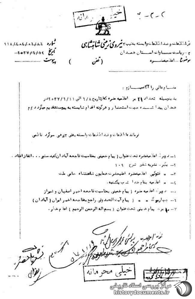 1- دو برگ اعلامیه مضره تحت عنوان پیام خمینی به مناسبت فاجعه آبادان که به دستور ... اتفاق افتاد.