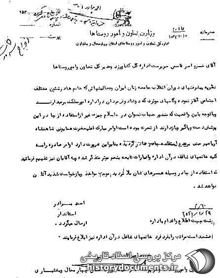 نظر به پیشرفتهاى دوران انقلاب جامعه زنان ایران و فعالیتهایى که خانمها در شئون مختلف اجتماعى آغاز نموده و گامهای مؤثرى که دوشادوش مردان در اداره امور مملکت برمىدارند و باتوجه به این واقعیت که منظور حجاب نسوان در اسلام چیزى غیر از استفاده از چادر، این پوشش دست و پاگیر و بازدارنده از تحرک بوده است، اوامر مبارک اعلیحضرت همایونى شاهنشاه آریامهر مبنى بر عدم استفاده چادر صادر گردیده؛ بنابراین ضرورت دارد اوامر صادره را به کلیه خانمهاى شاغل در آن اداره و ادارات تابعه به نحو مؤثر متذکر شده و به آقایان نیز تفهیم فرمایید که استفاده از چادر وسیله همسرهاىشان، بلاتردید موجب مؤاخذه و بازخواست شدید آنان خواهد شد.