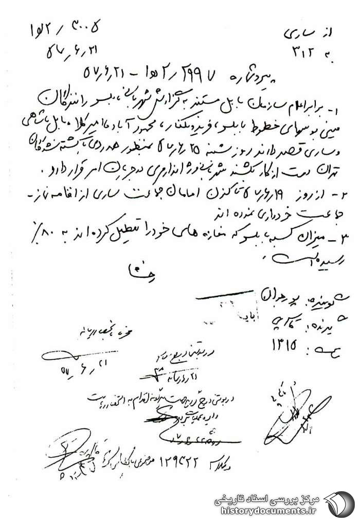 1- برابر اعلام سازمان بابل مستند به گزارش شهربانی بابلسر رانندگان مینیبوسهای خطوط بابلسر، فریدونکنار، محمودآباد، امیرکلا، بابل، شاهی و ساری قصد دارند روز شنبه 25 /6 / 57 به منظور همدردی با کشتهشدگان تهران دست از کار بکشند. شهربانی و ژاندارمری در جریان امر قرار دارد.