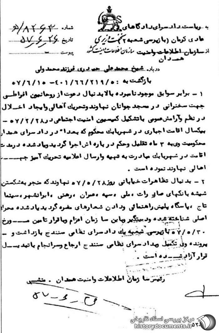 ۲- به دنبال تظاهرات خیابانی روز 28 /5 /57 نهاوند که منجر به شکستن شیشه بانکهای صادرات، ملی، سپه، عمران، رهنی، ایرانشهر، سینما تاج، پاسگاه پلیس راهنمایی و دادن شعارهای مضره گردیده یاد شده محرک اصلی شناخته شده و دستگیر و به این سازمان اعزام و به قرار تأمین مورخ 30 /5 /57 بازپرسی شعبه یک دادسرای نظامی سنندج بازداشت و پرونده وی تکمیل و به دادسرای نظامی سنندج ارجاع و سرانجام با تبدیل قرار آزاد شده است.