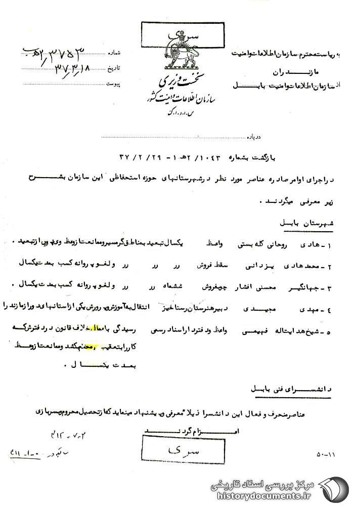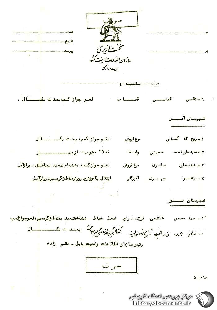 1- روحالله کمالی، مرغفروش، لغو جواز کسب به مدت یک سال 2- سیدعلی احمد حسینی واعظ، فعلاً ممنوعیت از منبر 3- عباسعلی صادری، مرغفروش، لغو جواز کسب، شش ماه تبعید به مناطق دور از آمل 4- زهرا سپهری، آموزگار، انتقال به آموزش و پرورش مناطق گرمسیر دور از آمل