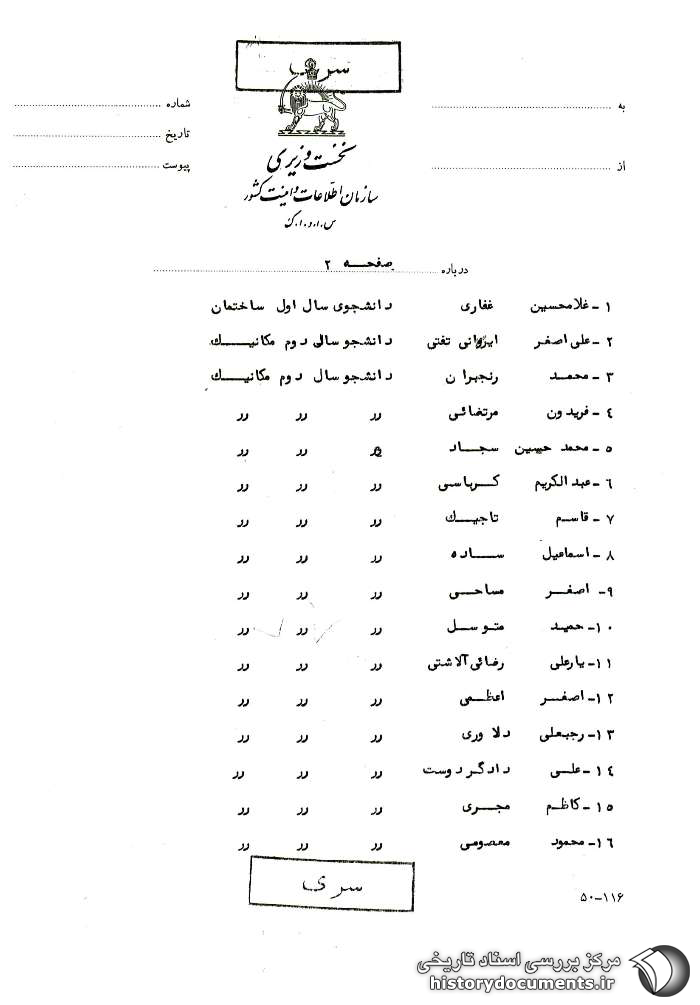 1-غلامحسین غفاری، دانشجوی سال اول ساختمان 2- علیاصغر ایروانی تفتی، دانشجوی سال دوم مکانیک 3- محمد رنجبران، دانشجوی سال دوم مکانیک 4- فریدون مرتضائی، دانشجوی سال دوم مکانیک 5- محمدحسین سجاد، دانشجوی سال دوم مکانیک 6- عبدالکریم کرباسی، دانشجوی سال دوم مکانیک 7- قاسم تاجیک، دانشجوی سال دوم مکانیک 8- اسماعیل ساده، دانشجوی سال دوم مکانیک 9- اصغر مسّاحی، دانشجوی سال دوم مکانیک 10- حمید متوسل، دانشجوی سال دوم مکانیک 11- یارعلی رضائی آلاشتی، دانشجوی سال دوم مکانیک 12- اصغر اعظمی، دانشجوی سال دوم مکانیک 13- رجبعلی دلاوری دانشجوی سال دوم مکانیک 14- علی دادگر دوست، دانشجوی سال دوم مکانیک 15- کاظم مجری، دانشجوی سال دوم مکانیک 16- محمود معصومی، دانشجوی سال دوم مکانیک 17- سیدحسن حکیمی، دانشجوی سال دوم مکانیک 18- زارع بزروشی، دانشجوی سال دوم مکانیک 19- احمد رضائی، دانشجوی سال دوم مکانیک