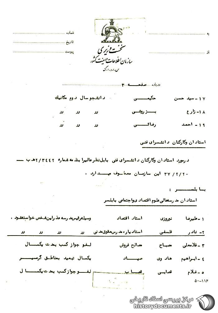 1- علیرضا نوروزی، استاد اقتصاد، وسیله رئیس مدرسه عذر این شخص خواسته شود. 2- نادر فلسفی، استادیار، مدرس حقوق مدنی، وسیله رئیس مدرسه عذر این شخص خواسته شود. 3- غلامعلی مصباح، مصالحفروش، لغو جواز کسب به مدت یک سال 4- ابراهیم هادوی، صیاد، یک سال تبعید به مناطق گرمسیر 5- غلام قصابی، قصّاب لغو جواز کسب به مدت یک سال 6- تقی قصابی، قصّاب، لغو جواز کسب به مدت یک سال