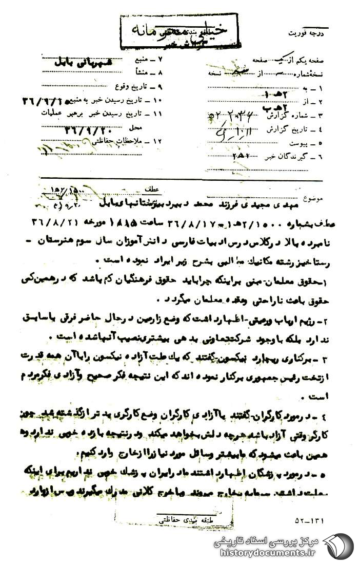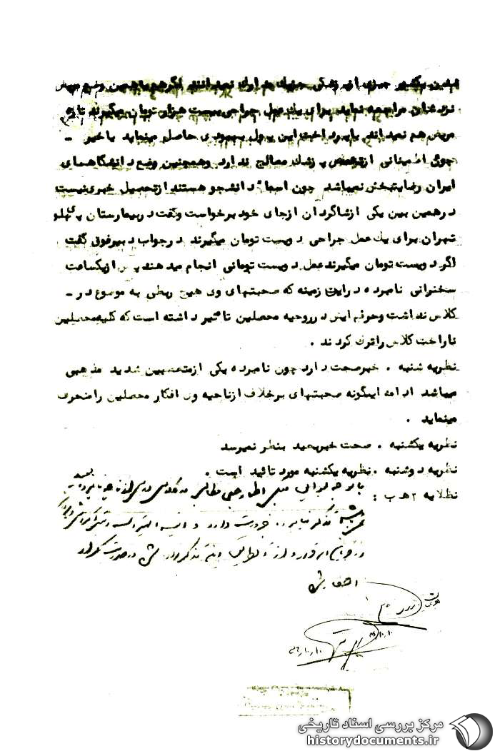 5- در مورد پزشکان اظهار داشتند ما در ایران پزشک خوبی نداریم برای اینکه علّت داشتن سرمایه به خارج میروند و با خرج کلانی مدرک میگیرند و پس از وارد شدن به کشور چیزی از پزشکی جز یک مدرک نمیدانند اگر هم با همین وضع مریض نزدشان مراجعه نماید برای یک عمل جراحی بیست هزار تومان میگیرند تازه مریض هم نمیداند با پرداخت این پول بهبودی حاصل مینماید یا خیر. چون اطمینانی از تشخیص پزشک معالج ندارد و همچنین وضع دانشگاههای ایران رضایت بخش نمیباشد چون اسماً دانشجو هستند از تحصیل خبری نیست در همین بین یکی از شاگردان از جای خود برخواست و گفت در بیمارستان پهلوی تهران برای یک عمل جراحی دویست تومان میگیرند در جواب دبیر فوق گفت: اگر دویست تومان میگیرند عمل دویست تومانی آنجام میدهند پس از یک ساعت سخنرانی نامبرده در این زمینه که صحبتهای وی هیچ ربطی به موضوع درس کلاس نداشت و حرفهایش در روحیه محصّلین تاثیر داشته است که کلّیه محصّلین ناراحت کلاس را ترک کردند.