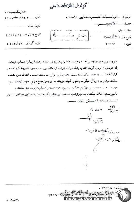 در چند روز اخیر موضوعی که اعلیحضرت همایونی در نطق خود در همدان به آن اشاره فرموده که هر نفر 25 ریال گرفتهاند و در تظاهرات[پانزده خرداد] شرکت کردهاند، بین مردم مورد تنفر و گفتگو و تمسخر قرار گرفته است و همه میگویند ببینید چقدر مردم ایران بدبخت شدهاند که در پایتخت مملکت مردم 25 ریال میگیرند و جلوی گلوله میروند و برای چنین مبلغ جزئی خود را به کشتن میدهند. همه مردم روی این مطلب به همین نحو صحبت و اظهار نظر و مسخره میکنند.