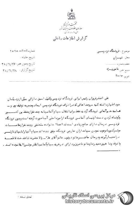 علیاصغر فروزان، رئیس ایرانی فروشگاه فردوسی و کفیل اسبق دارایی، به یکی از نزدیکان خود اظهار داشته: کلیه سروصداهایی که در اطراف فروشگاه فردوسی ایجاد و منجر به توقیف وی و هابیه، مدیر آلمانی فروشگاه گردید، فقط برای انتقال سهام آلمانیها به چند نفر از متنفذین کشور و کوتاه کردن دست اولیای آلمانی فروشگاه از امور داخلی آنجا صورت گرفته است و چون فروشگاه فردوسی در سال دارای منافع زیادی است، لذا اعضای خانواده سلطنتی و چند نفر از مقامات مؤثر کشور، با مرعوب نمودن سهامداران خارجی فروشگاه، موفق شدهاند سهام آنها را با بهای نازلی در اختیار گیرند و در حال حاضر خانم دولو، خانم آقای علا، والاحضرت شاهدخت فاطمه و اشرف و شاهپور حمیدرضا و خانم ناصر وزیر دارایی در خرید سهام آلمانیها نقش مؤثر را ایفا نمودهاند.
