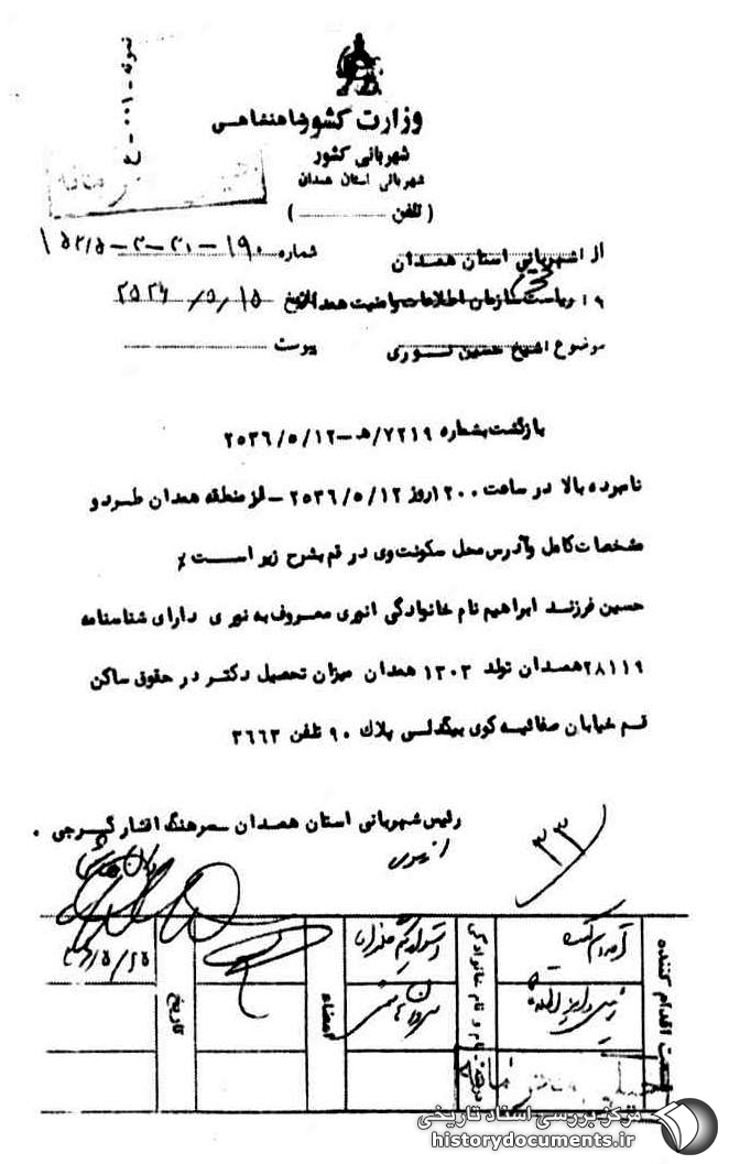 نامبرده بالا در ساعت ۱۲ روز 12 /5 /39 از منطقه همدان طرد و مشخصات کامل و آدرس محل سکونت وی در قم به شرح زیر است: