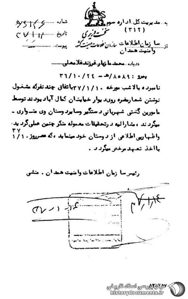 نامبرده بالا شب مورخه 10 /1 /37 به اتفاق چند نفر که مشغول نوشتن شعار مضره روی دیوار خیابان کمالآباد1 بودند توسط مأمورین گشتی شهربانی دستگیر و سایر دوستان وی متواری میگردند، مشارالیه در تحقیقات معموله منکر چنین عملی گردید و اظهار بیاطلاعی از دوستان خود مینماید، که عصر روز 10 /1 /37 با اخذ تعهد مرخص میگردد.
