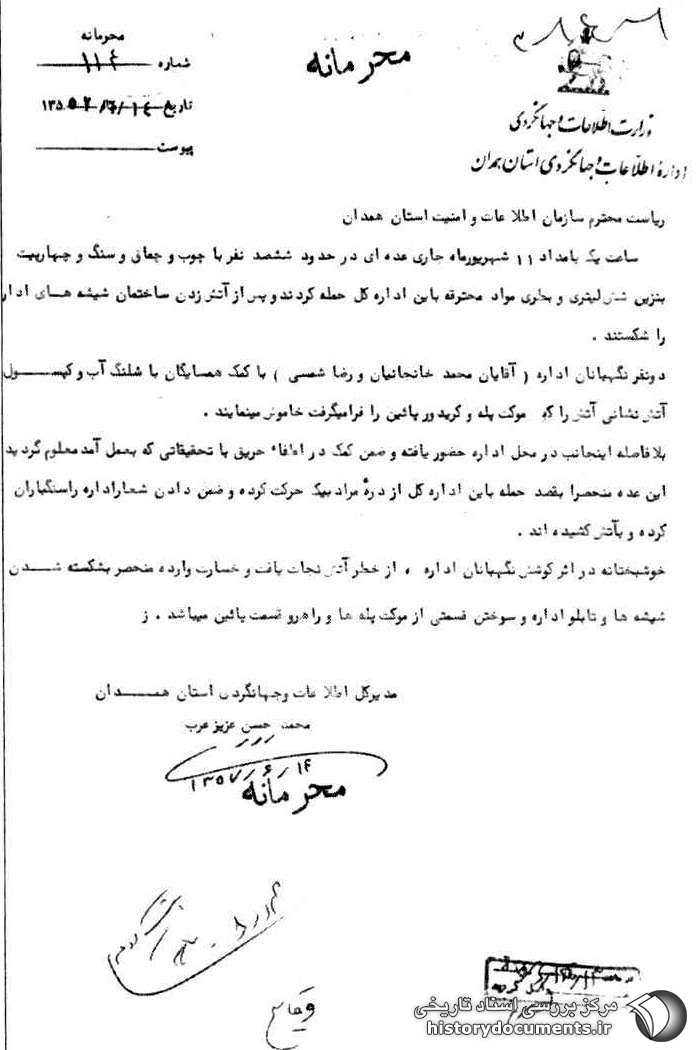 بلافاصله اینجانب در محل اداره حضور یافته و ضمن کمک در اطفاء حریق با تحقیقاتی که به عمل آمد معلوم گردید این عده منحصراً بقصد حمله به این اداره کل از دره مراد بیک حرکت کرده و ضمن دادن شعار اداره را سنگباران کرده و به آتش کشیدهاند.