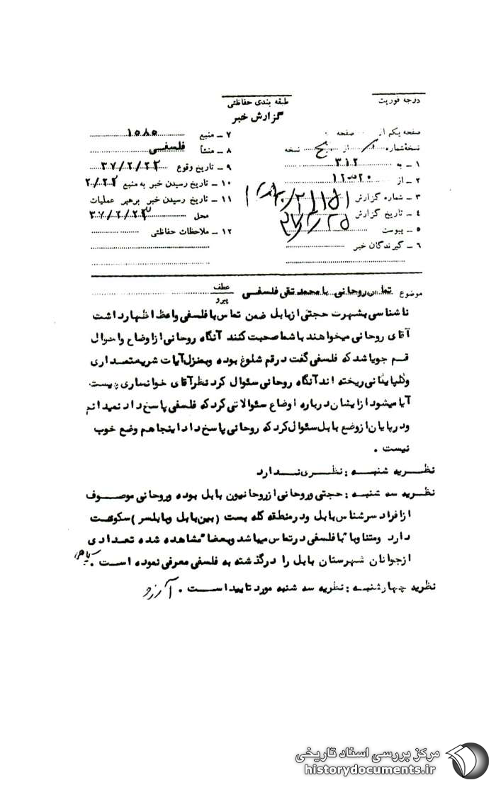 ناشناسی به شهرت حجتی1 از بابل ضمن تماس با فلسفی واعظ اظهار داشت آقای روحانی میخواهند با شما صحبت کنند آنگاه روحانی از اوضاع و احوال قم جویا شد که فلسفی گفت در قم شلوغ بوده و به منزل آیات شریعتمداری و گلپایگانی ریختهاند آنگاه روحانی سئوال کرد نظر آقای خوانساری چیست؟ آیا میشود از ایشان درباره اوضاع سئوالاتی کرد که فلسفی پاسخ داد نمیدانم و در پایان از وضع بابل سئوال کرد که روحانی پاسخ داد اینجا هم وضع خوب نیست.