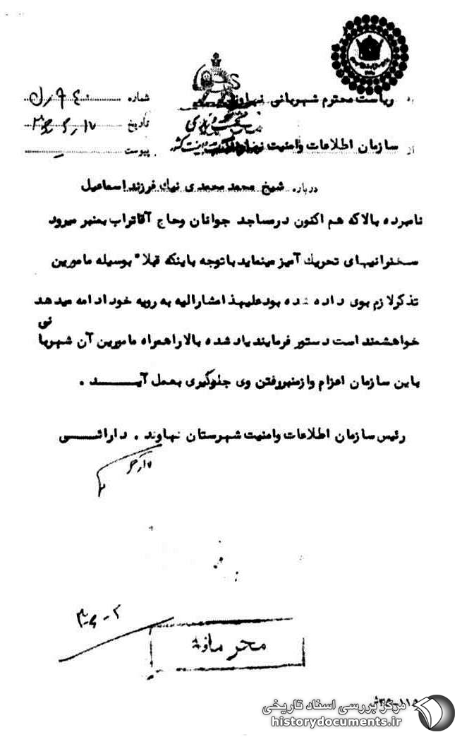 نامبرده بالا که هم اکنون در مساجد جوانان و حاج آقا تراب به منبر میرود سخنرانیهای تحریکآمیز مینماید با توجه به اینکه قبلاً به وسیله مأمورین تذکر لازم به وی داده شده بود علیهذا مشارالیه به رویه خود ادامه میدهد خواهشمند است دستور فرمایند یاد شده بالا را همراه مأمورین آن شهربانی به این سازمان اعزام و از منبر رفتن وی جلوگیری به عمل آید.