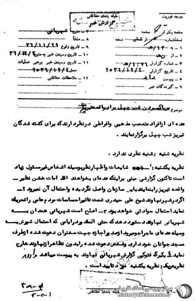 نظریه یکشنبه: ۱- شایعات و اظهار نظر به وسیله اشخاص غیر مسئول زیاد است تاکنون گزارشی مبنی بر اینکه عدهای بخواهند اقدامات خشن نظیر واقعه تبریز را بنمایند به این سازمان واصل نگردیده و احتمال آن نمیرود. ۲- اگر در شهر نهاوند شیخ علی حیدری تحت تاثیر احساسات مردم عامی را تحریک نماید احتمال حوادثی خواهد بود. ۳- اصلح است شهربانی همدان به شهربانی نهاوند دستور دهد که حتیالمقدور در ایامی که احتمال شورش به وسیله عدهای ماجراجو میرود از صدور اجازه جهت سخنران دعوت شده از طرف مسجد جوانان خودداری و شخص دعوت شده را بدون تظاهر از نهاوند خارج نمایند 4- یک برگ فتوکپی گزارش شهربانی نهاوند به پیوست میباشد.