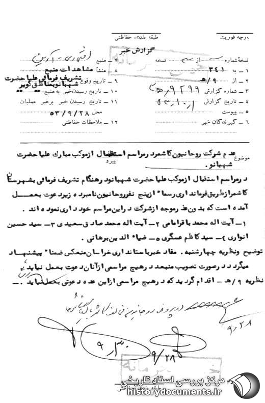 در مراسم استقبال از موکب علیاحضرت شهبانو در هنگام تشریففرمایی به شهرستان کاشمر از طریق فرمانداری رسماً از پنج نفر روحانیون نامبرده زیر دعوت به عمل آمده است که بدون عذر موجه از شرکت در این مراسم خودداری نمودهاند.