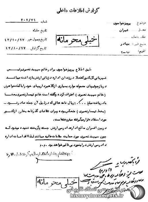 طبق اطلاع، پرویز خواجوی، برادر خانم سپهبد نصیری، رئیس شهربانی کل کشور که فعلاً در زندان اداره دژبانی ارتش بازداشت میباشد، در بازجوییهای معموله موارد بسیاری از کلاهبرداریهای خود را با کمک خواهرش (خانم سپهبد نصیری) اعتراف کرده و گفته است: خانم تیمسار نصیری بعضاً با دریافت مبلغ 000 /10 ریال، نامههایی که در ذیل آن جمله صادر شود (به خط تیمسار نصیری) منعکس بوده و برای تقاضای گذرنامه به خارج از کشور مورد استفاده قرار میگرفته، میفروخته است.