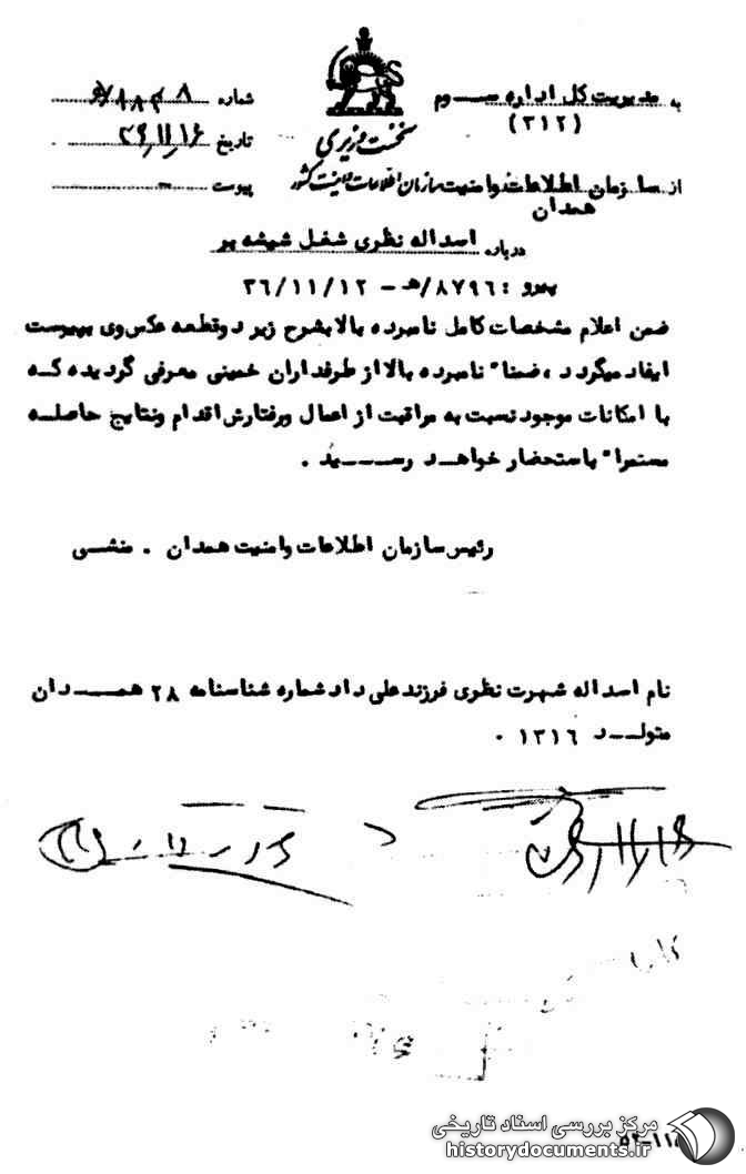 نام اسداله شهرت نظری فرزند علیداد شماره شناسنامه ۲۸ همدان متولد ۱۳۱6