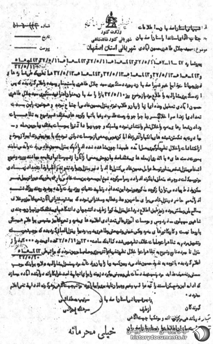 همان طورى که طى شمارههاى فوق جریانات وقایع اخیر شهر اصفهان در مورد دستگیرى سید جلال طاهرى به استحضار رسیده و اعلام گردیده که پس از دستگیرى مشارالیه و اطلاع مردم از موضوع روز 10 /5 /37 بازار اصفهان به عنوان اعتراض دستگیرى سید جلال طاهرى حسینآبادى تعطیل و عدهاى از بازاریان و طلاب نیز در منزل حسین خادمى اجتماع نموده و همچنین در این مدت تعدادى از عناصر اخلالگر و ماجراجو و فرصتطلب در خیابانها و کوچههاى مختلف شهر شروع به تظاهرات و دادن شعارهاى مضره و اخلال نظم و اغتشاش نموده و با سنگ و چوب و مواد آتشزا به مؤسسات مختلف و مأمورین حمله و مبادرت به شکستن شیشههاى بانکها و آتش زدن اماکن عمومى و بعضى از مؤسسات دولتى نموده که با پیشبینى و تدابیر لازم به موقع از اغتشاشات و اخلال نظم جلوگیرى به عمل آمده علیهذا چون مشاهده شده افرادى که به منزل حسین خادمى رفت و آمد مىنمایند به صورت دستههاى 5 یا 6 نفرى از محلههاى مختلف اصفهان و حتى بعضى از آنان از شهرستانهاى تابعه مىباشند و ورود و خروج اشخاص به منزل شخص منظور توسط عوامل حسین خادمى کنترل تا افراد غیر به منزل وى وارد نشوند و اغلب اوقات تعدادى زیادى موتورسیکلت دوچرخه متعلق به اینگونه افراد در سراسر کوچه شیخ ابو مسعود بن بست خادمى پارک به طورى که عبور اتومبیل غیرممکن و فقط پیاده مىتوان از کوچه مذکور عبور نمود این تعداد در تمام مدت شبانه روز در رفت و آمد بود و در چند روز گذشته افراد معمم حاضر در منزل خادمى براى حاضرین وعظ و خطابه و سخنرانى نموده که بیشتر سخنرانى آنان تحریکآمیز و برخلاف مصالح ملى و مملکتى بوده و نیز طبق اطلاع در داخل منزل مذکور از طرف دانشجویان دانشگاههاى مختلف کشور تهران ـ جندى شاهپور ـ پهلوى ـ فردوسى و مؤسسات آموزش عالى تعدادى اعلامیههاى مضره و تحریکآمیز مبنى بر اعلام همبستگى با روحانیت و کاریکاتورهاى مضره و عکس خمینى و شریعتى و طاهرى به در و دیوار منزل الصاق گردیده که موجب تحریک و تشویق مردم به تظاهرات و عملیات خلاف نظم عمومى شده کما اینکه ساعت 2300 روز 19 /5 /37 عدهاى حدود 2000 نفر از منزل نامبرده خارج و شروع به تظاهرات و اخلال نظم و تحریک و آتشسوزى و حمله به مأمورین نموده که مراتب طى 20 /5 /37 ـ 443ـ 5ـ51 اعلام گردیده با توجه به نفوذ حسین خادمى در بین کسبه و بازاریان و رفت و آمد مردم به منزل مشارالیه علاوه بر اینکه موجب سستى و تضعیف عقاید مردم نسبت به مقدسات ملى و میهنى مىگردد زمینه را براى انجام مقاصد خرابکارانه در آینده آماده مىسازد که ادامه این وضع ممکن است در آتیه عواقب وخیم و جبران ناپذیرى را به بار آورد مراتب جهت آگاهى و هرگونه اقدام مقتضى اعلام مىگردد.