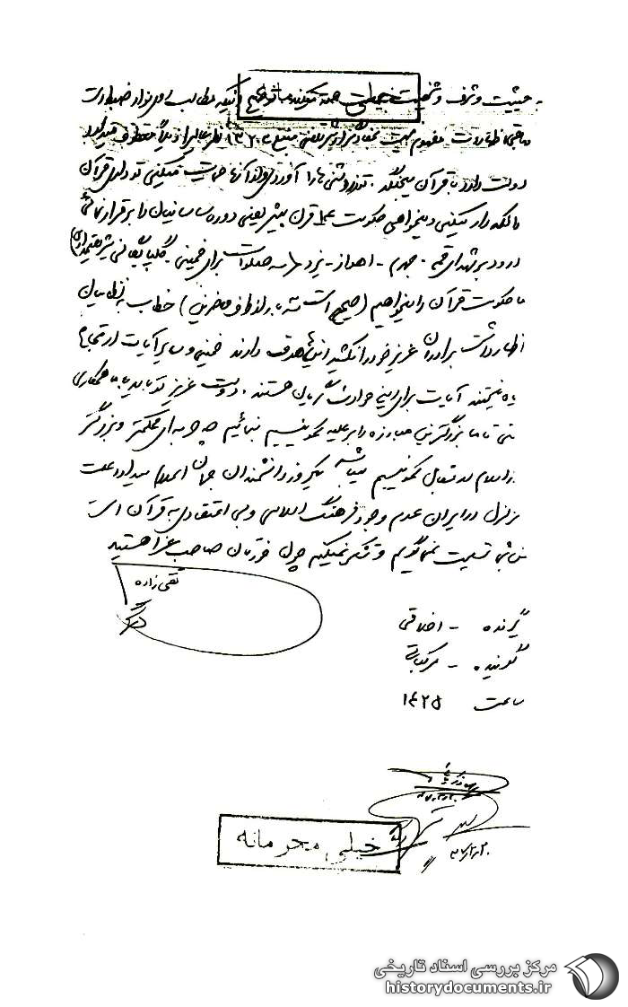 از ساعت 1750 روز 19 /2 /37 در مسجد جامع بابل مجلس ترحیمی به مناسبت چهلّمین روز کشته شدگان قم، جهرم، یزد، اهواز تشکیل و هادی روحانی کلّهبستی واعظ مجلس ابتدا از شرکتکنندگان تشکر و اضافه نموده غرض از تشکیل مجلس روشن است و به عنوان یادآوری و تذکر و بزرگداشت فداکاریهای آنانی که چهل روز قبل برای دین عزیزشان و قرآنشان و جهت شادی روح آنان این مجلس از طرف جامعهی روحانیون شهر برگزار شده است. جا دارد از عنایات شما تشکر کنم و راستش این است که من از این تشکر خجالت میکشم و اما چون همه صاحب مجلس و صاحب عزا هستید و عزا عزای عمومی باشد جای تشکر نیست و وظیفه وظیفه همه است و همه صاحب مصیبتاند و از خدا میخواهیم که پیوند ما را به هم محکمتر بفرماید، بنابراین همه ما در نظم و آرامش سهیم هستیم و اما غرضم در زمینه بیماری اگر یک نفر، دو نفر و ده نفر به بیماری گوناگون مبتلا شوند میروند به سراغ طبیبی که دردشان را تشخیص بدهد و دوائی بدهد درد را ریشهکن کند هدف دیگری ندارند. بیماری یا بیماری جسمی است و به جان یک نفر حمله میکند و اما بیماریهای دیگری هم در عالم هست که بیماریهای اجتماعی است که اگر جامعه به بیماریهای اجتماعی مبتلا شود یک منطقه و یا یک مملکتی را مبتلا میکند. بیماریهای اجتماعی به حیثیت و شرف و شخصیت جمعیت حمله میکند. توضیح این که مطالب روی نوار ضبط است و مابقی اظهارات مفهوم نیست. به مفاد گزارش تلفنی منبع 13203 نظر عالی را ذیلاً معطوف میدارد، دولت دارد با قرآن میجنگد. [ناخوانا] دشمنیها را آوردی و از آنها حمایت میکنی، تو داری قرآن را لکهدار میکنی و میخواهی حکومت 14 قرن پیش یعنی دوره ساسانیان را برقرار نمائی. درود بر شهدای قم، جهرم، اهواز، یزد (سه صلوات برای خمینی، گلپایگانی و شریعتمداری) ما حکومت قرآن را میخواهیم (صحیح است سه بار از طرف حاضرین) خطاب به نظامیان اظهار داشت برادران عزیز خود را نکشید، اینها هدف دارند خمینی و سایر آیات ارتجاع سیاه نیستند، آیات برای این حوادث گریان هستند. دوست عزیز تو باید با ما همکاری کنی تا ما بزرگترین مبارزه را بر علیه کمونیسم بنمائیم چه حربهای محکمتر و بزرگتر از اسلام در مقابل کمونیسم میباشد یک روز دانشمندان جهان اعلام میدارد علّت تزلزل در ایران عدم وجود فرهنگ اسلامی و بی اعتقادی به قرآن است، من به شما تسلیت نمیگویم و تشکر نمیکنم چون خودتان صاحب عزا هستید.