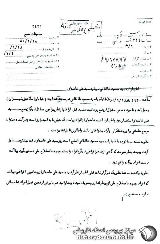 ساعت 1930 روز 28 /6 در ملاقاتی که با سیدمحمود طالقانی در مسجد هدایت (خیابان اسلامبول تهران) به عمل آمده، نامبرده ضمن سؤال از وضع روحانیت مشهد، قبل از اظهارنظر پیرامون مسایل دیگر، از وضع سیدعلی خامنهای استفسار نمود و اظهار داشت: خامنهای از افرادی است که خیلی مایه امیدواری است و در آینده میتواند مرجع مطمئنی برای روشنفکران و آزادیخواهان باشد و افکارش قابل تقدیر است.