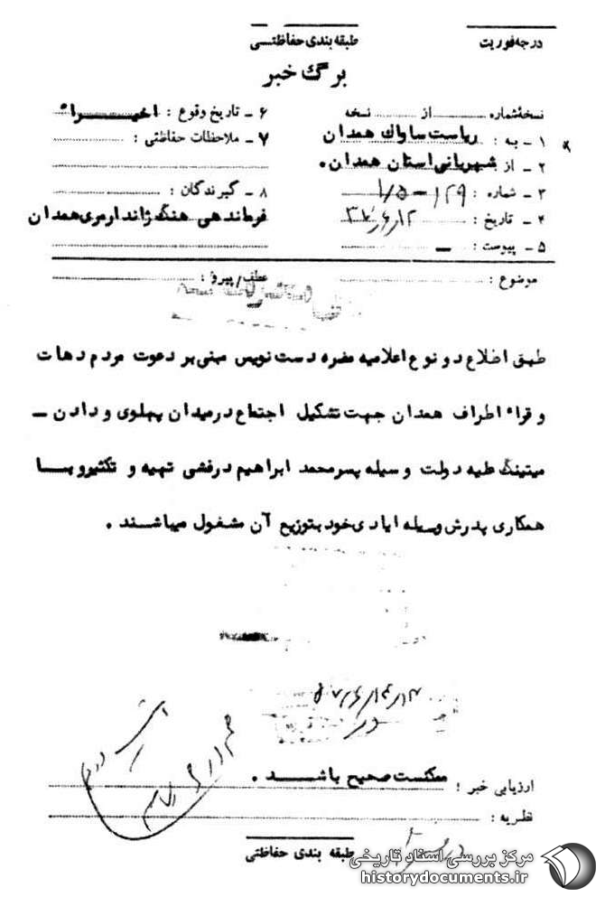 طبق اطلاع دو نوع اعلامیه مضره دست نویس مبنی بر دعوت مردم دهات و قراء اطراف همدان جهت تشکیل اجتماع در میدان پهلوی و دادن میتینگ علیه دولت وسیله پسر محمدابراهیم درفشی تهیه و تکثیر و با همکاری پدرش وسیله ایادی خود به توزیع آن مشغول میباشند.
