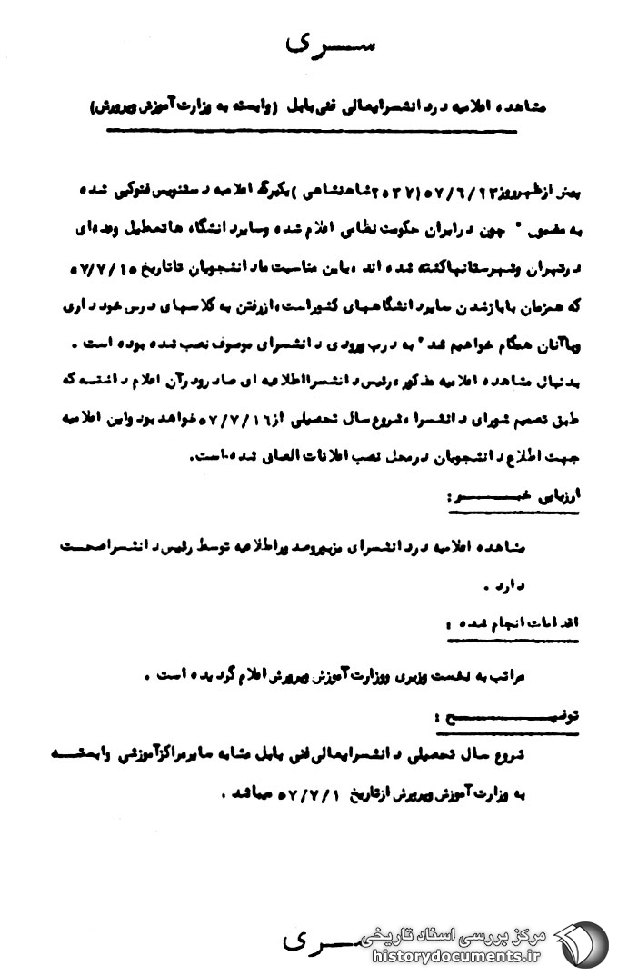 شروع سال تحصیلی دانشسرای عالی فنی بابل مشابه سایر مراکز آموزشی وابسته به وزارت آموزش و پرورش از تاریخ 1 /7 /57 میباشد.