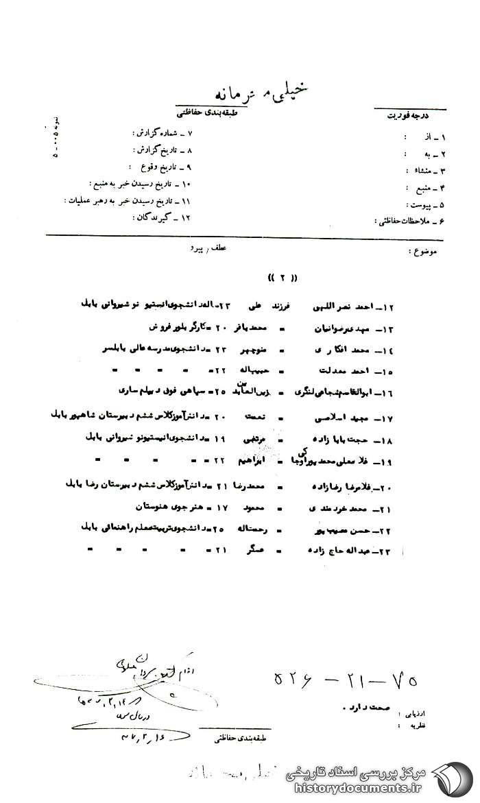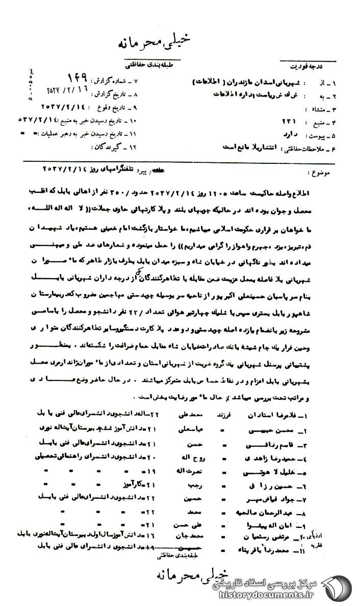 اطلاع واصله حاکیست ساعت 1205 روز 14 / 2/ 2537 حدود 350 نفر از اهالی بابل که اغلب محصّل و جوان بودهاند در حالی که چوبهای بلند و پلاکاردهائی1 حاوی جملات «لا اله الا الله، ما خواهان برقراری حکومت اسلامی میباشیم، ما خواستار بازگشت امام خمینی هستیم، یاد شهیدان قم، تبریز، جهرم و اهواز را گرامی میداریم» را حمل مینموده و شعارهای ضدملّی و میهنی میدادهاند، به طور ناگهانی در خیابان شاه و سبزهمیدان بابل به طرف بازار ظاهر که مأموران شهربانی بلافاصله به محل عزیمت، ضمن مقابله با تظاهرکنندگان یکی از درجهداران شهربانی بابل به نام سرپاسبان حسنعلی اکبرپور از ناحیه سر به وسیله چوبدستی مهاجمین مضروب که در بیمارستان شاهپور1 بابل بستری سپس با شلیک چهار تیر هوائی تعداد 22 نفر دانشجو و محصّل را به اسامی مشروحه زیر به انضمام یازده اصله چوبدستی و دو عدد پلاکار دستگیر و سایر تظاهرکنندگان متواری حین فرار یک جام شیشه بانک صادرات خیابان شاه مقابل حمّام ظرافت را شکستهاند. به منظور پشتیبانی پرسنل شهربانی یک گروه ضربت از شهربانی استان و تعدادی از مأمورین ژاندارمری محل به شهربانی بابل اعزام و در نقاط حسّاس بابل متمرکز میباشند. در حال حاضر وضع عادّی و مراتب تحت بررسی میباشد حال مأمور رضایت بخش است.2